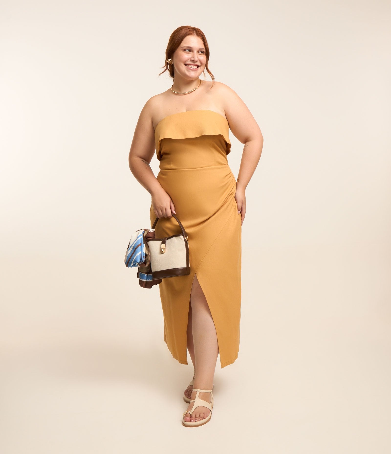 Gonna midi a portafoglio giallo senape per taglie forti e taglie forti con lino