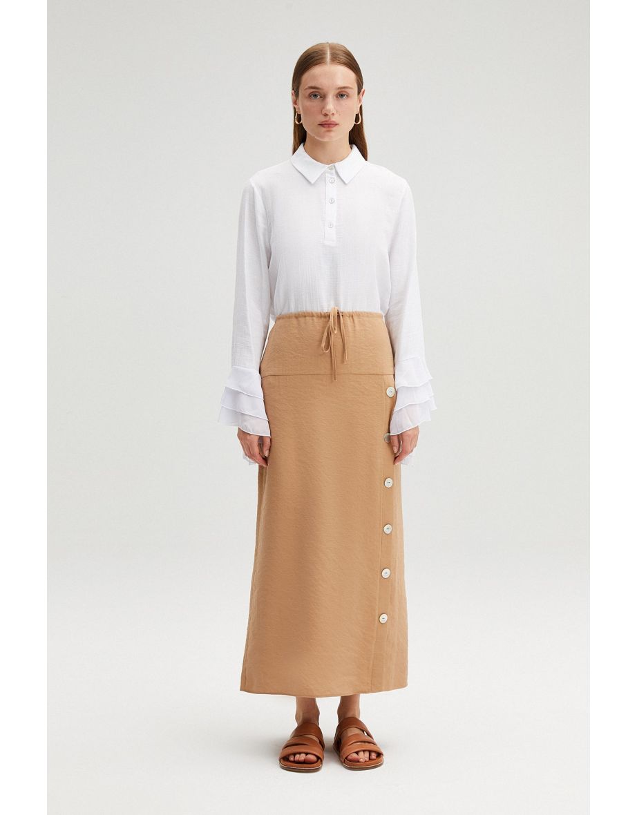 La Gonna in TENCEL con bottoni a conchiglia di Touché è l'aggiunta perfetta al tuo guardaroba per creare look quotidiani chic e senza sforzo.