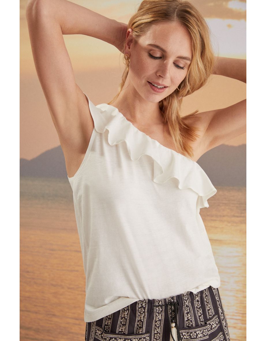 Il top asimmetrico bianco da donna, realizzato in cotone al 100%, è l'aggiunta perfetta al tuo guardaroba per uno stile quotidiano e chic.