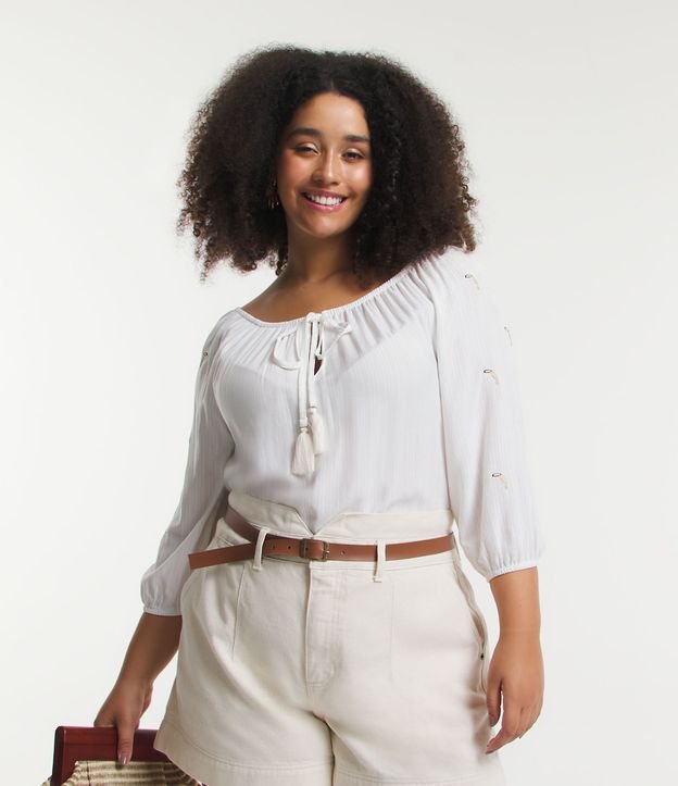 3/4 Sleeve Textured Viscose Embroidered Blouse, Curve & Plus Size, Off White
