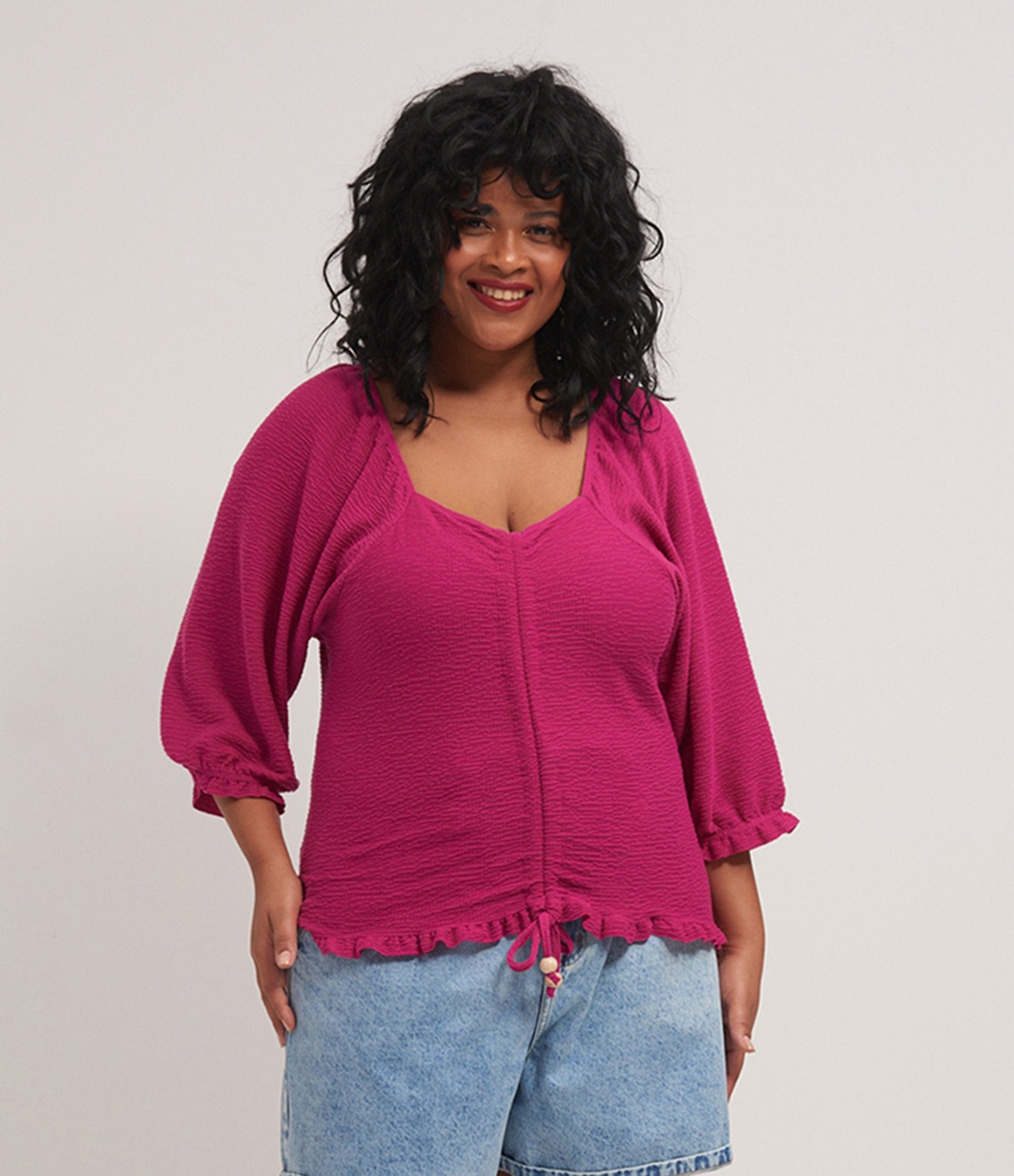 The 3/4 Sleeve Textured Blouse with Front Ruching in Curve & Plus Size Pink by Ashua Curve is crafted to embrace and enhance your curves with style and confidence. Ideal for any occasion, this piece seamlessly combines comfort and elegance in a flattering design.