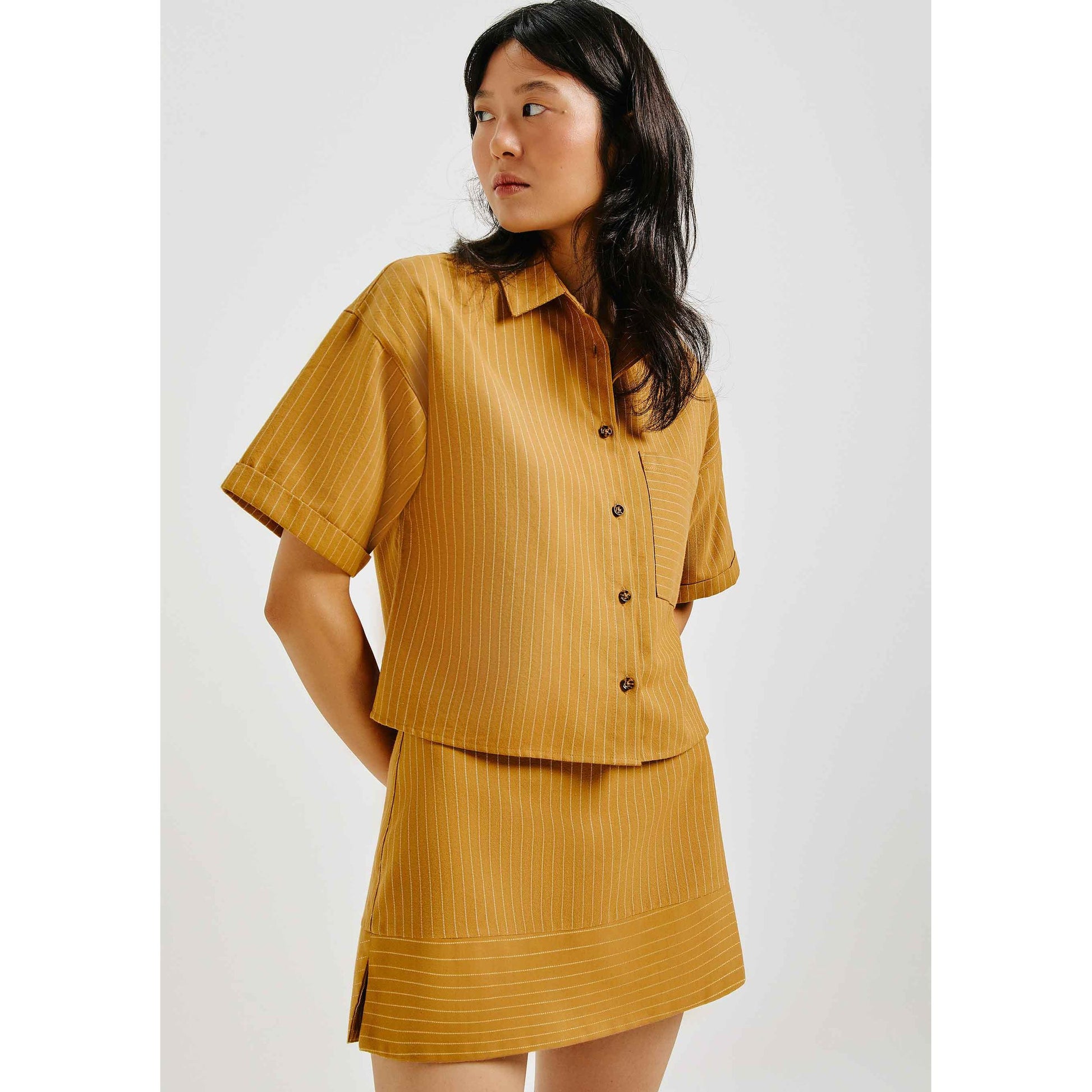 The Women's Cropped Short Sleeve Yarn-Dyed Shirt in Brown by Hering is the perfect addition to your wardrobe for essential, everyday style.