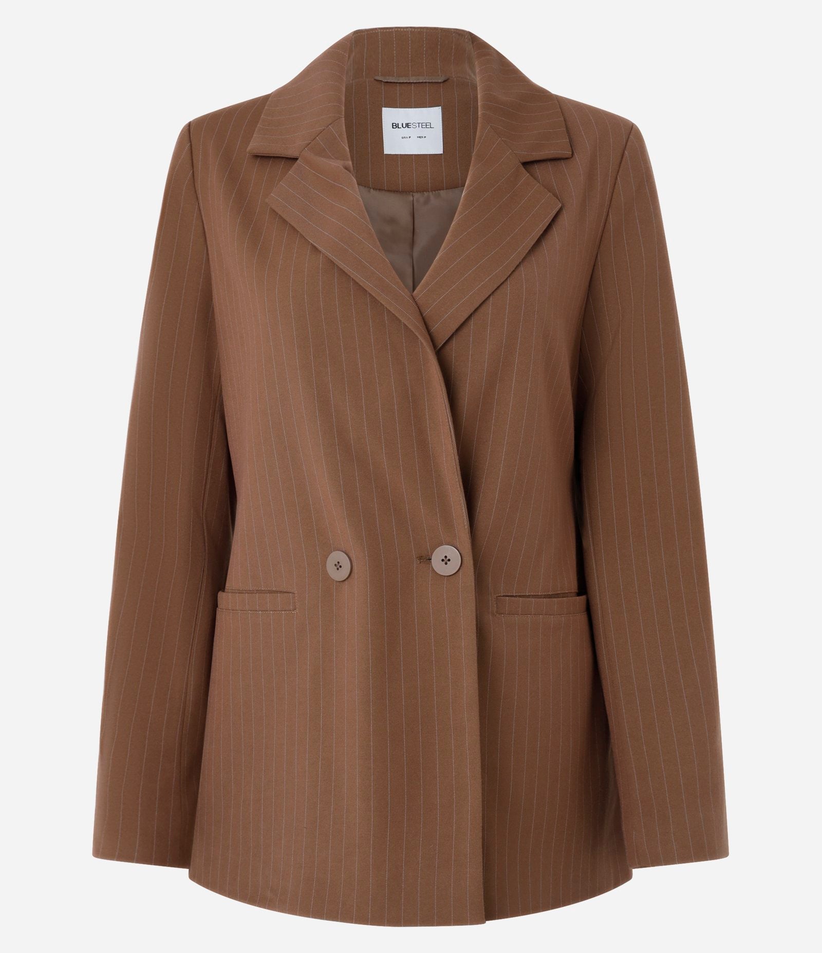 Long Tailored Pinstripe Blazer with Brown Buttons