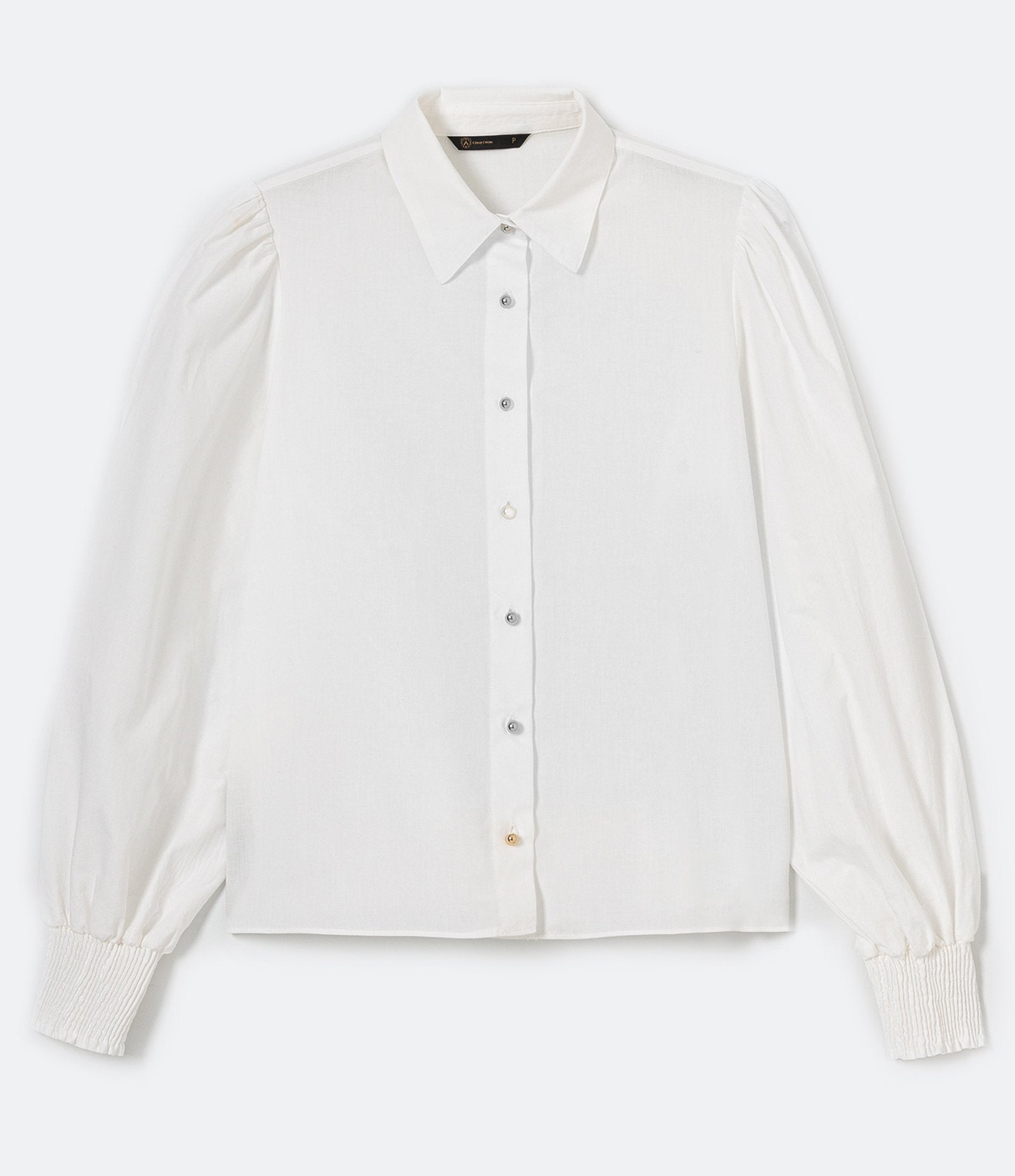Long Sleeve Puff Blouse in White Polka Dot Tricoline