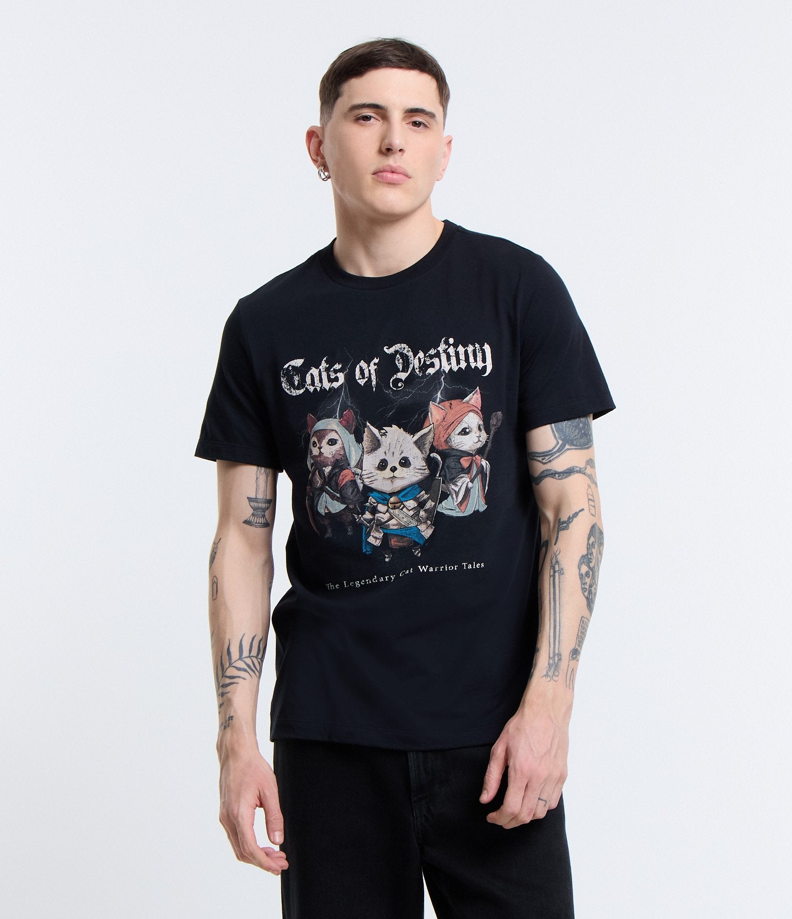 Regular Fit Cotton T-Shirt with "Cats of Destiny" Print in Black