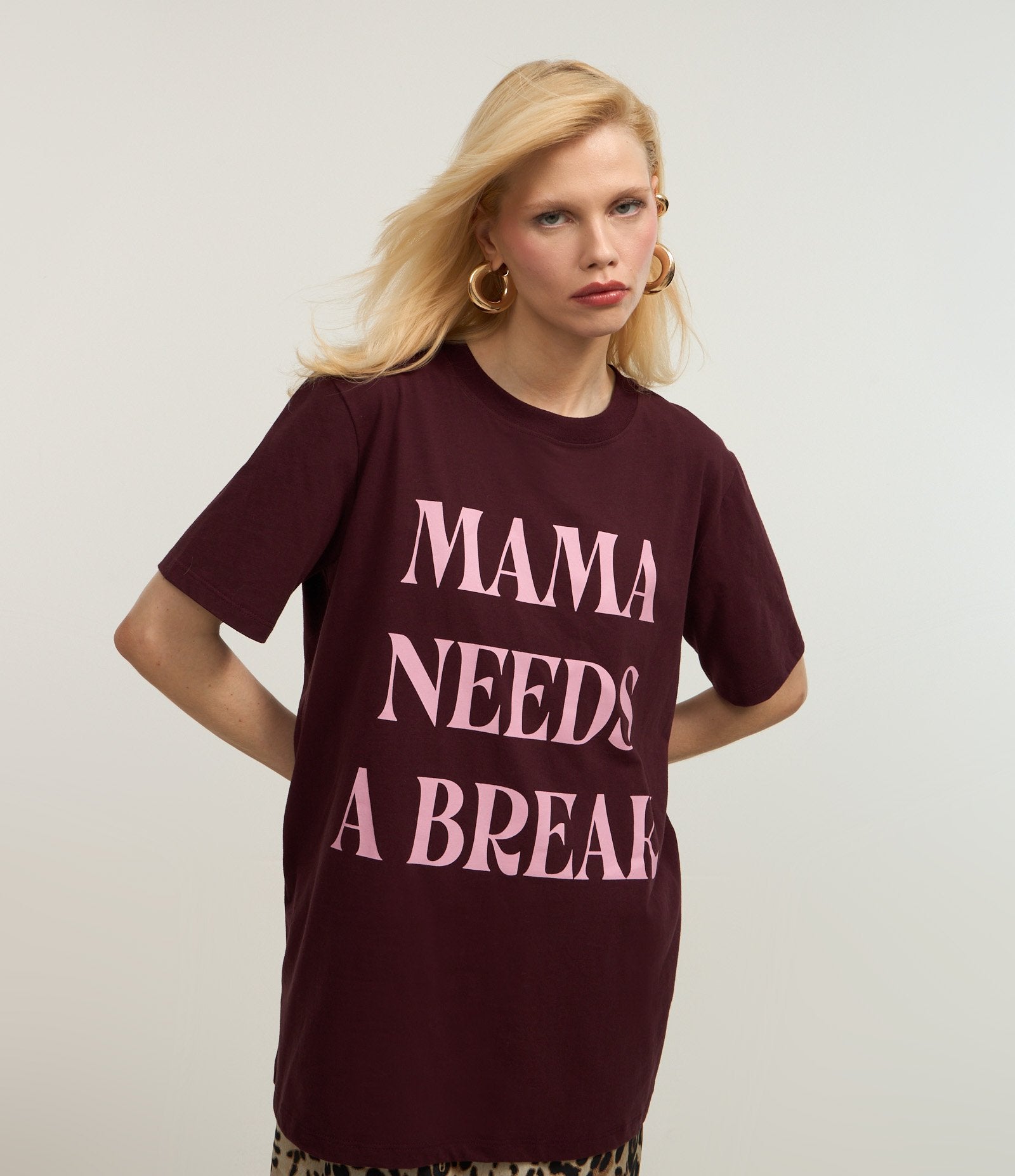 Cotton T-Shirt with "Mama Needs a Break" Lettering in Burgundy