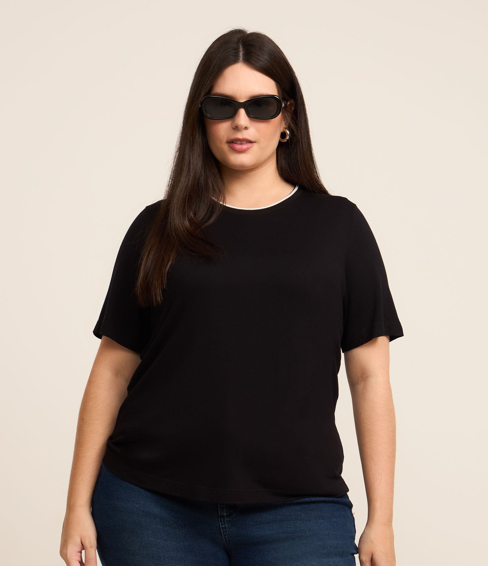 Camiseta Crepe com Gola Listrada, Tamanhos Curve e Plus, Preta