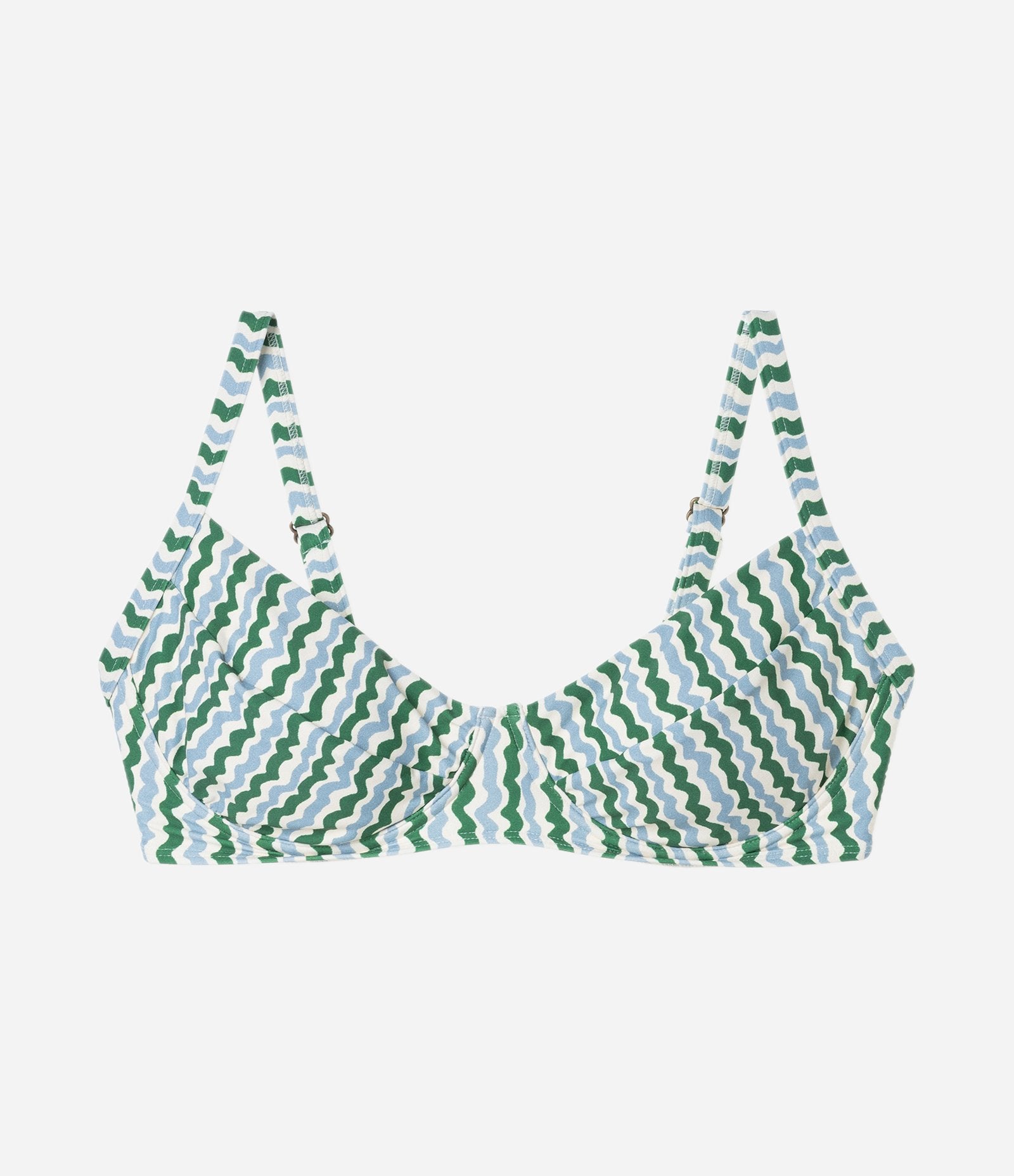 Top de biquíni meia-copa de microfibra com estampa de ondas, tamanho curvo e plus size, verde e azul