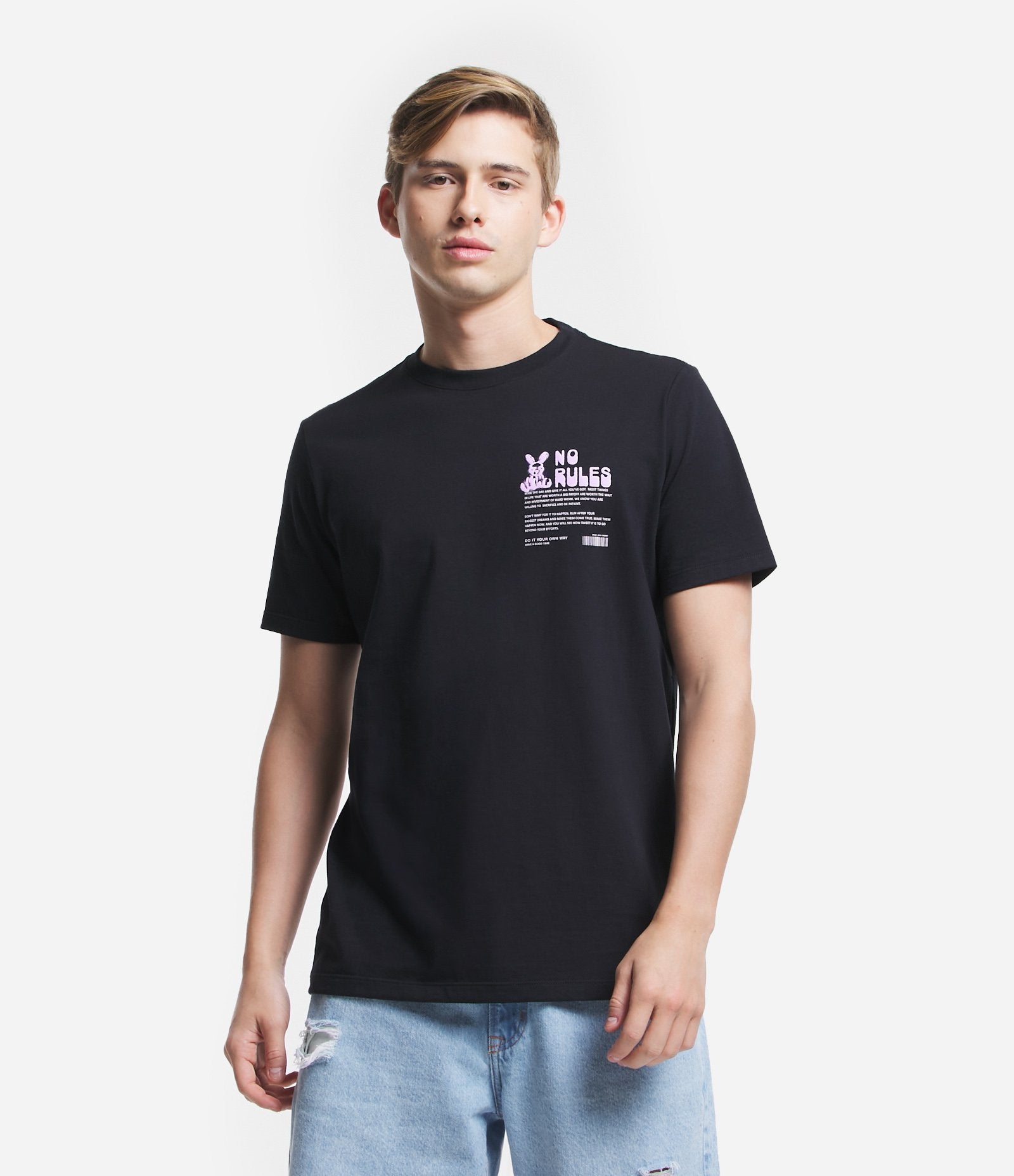 Camiseta regular em tecido de malha preta com estampa "No Rules