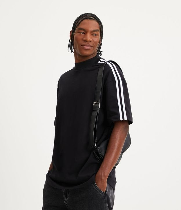 Camiseta relaxada de gola alta em preto com listras nos ombros
