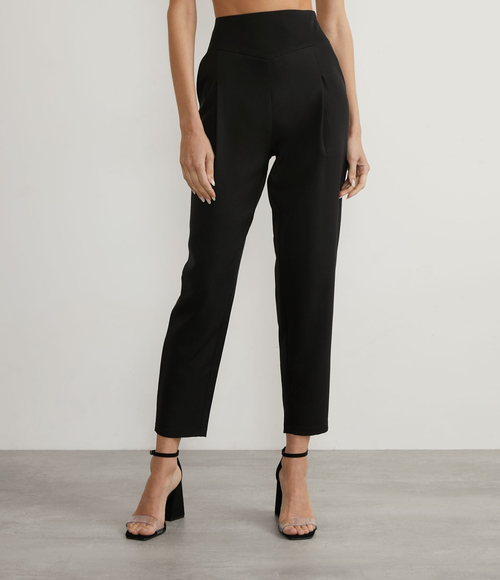 Calça de crepe com ajuste em cenoura com detalhe em V na cintura e pregas em preto da Blue Steel - experimente o conforto, a qualidade e o estilo em cada peça.