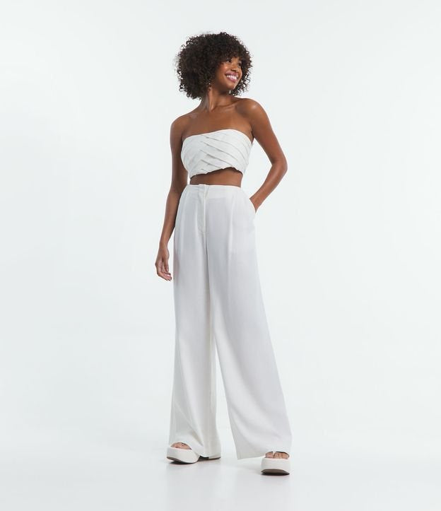 Calça de linho branca de perna larga com pregas e bolsos