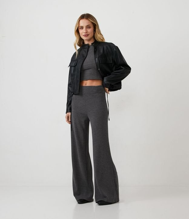 Calça Palazzo cinza de camurça texturizada com nervuras e cós elástico