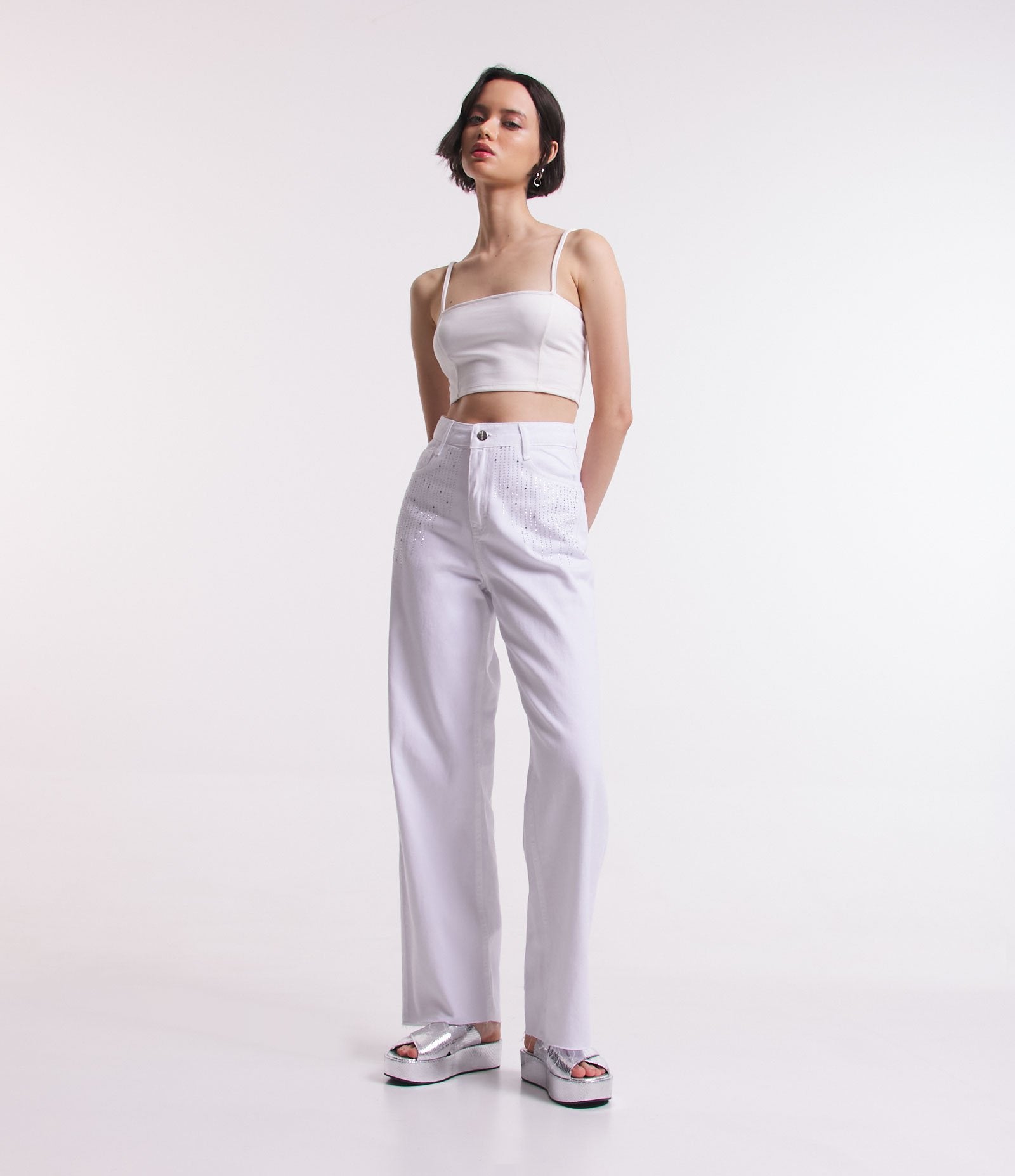 Calça de sarja de perna larga com strass branco em cascata da Blue Steel - Experimente o conforto incomparável, a qualidade excepcional e o estilo sem esforço em cada peça.