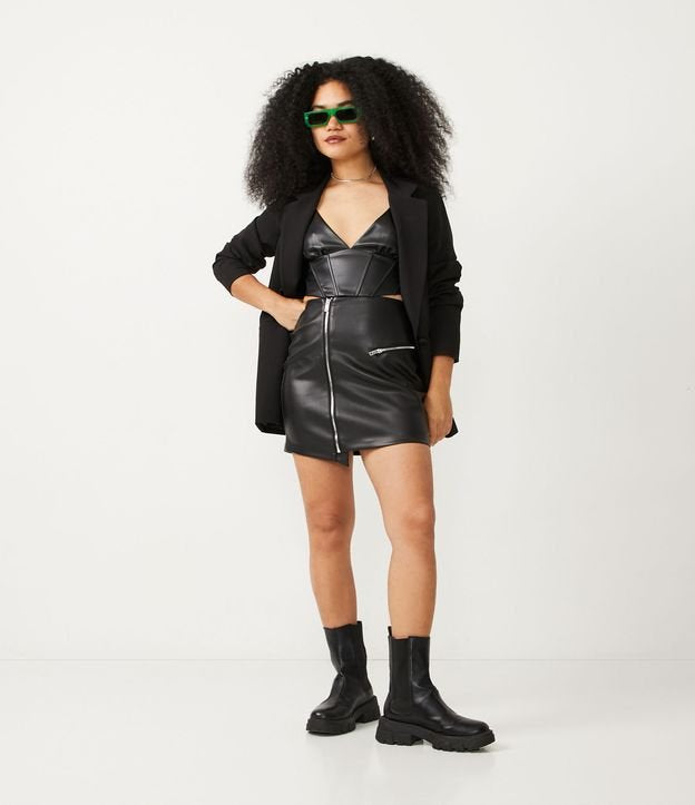 Saia curta preta com bainha assimétrica e bolso com zíper