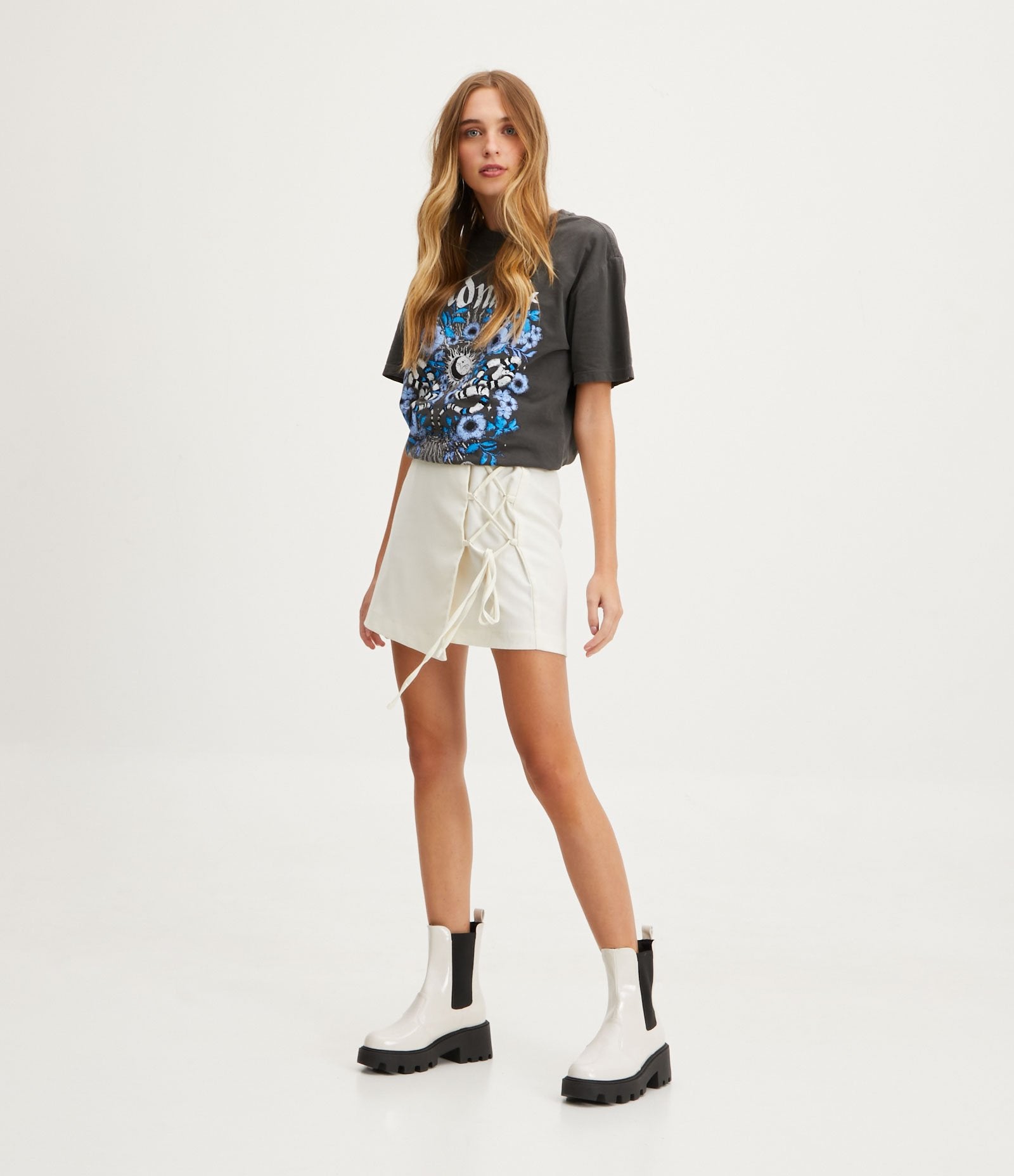 Mini-saia bege de cintura alta com amarração lateral da Blue Steel - Experimente a combinação perfeita de conforto, qualidade e estilo em cada peça.