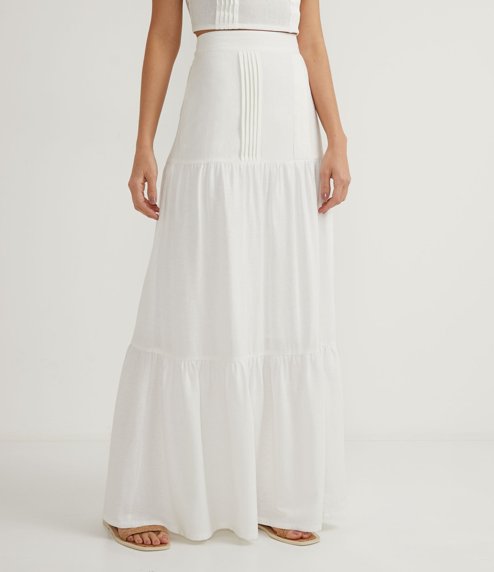 Saia longa em viscolinen branco com pregas frontais e babados da Blue Steel - experimente o conforto, a qualidade e o estilo incomparáveis em cada peça.