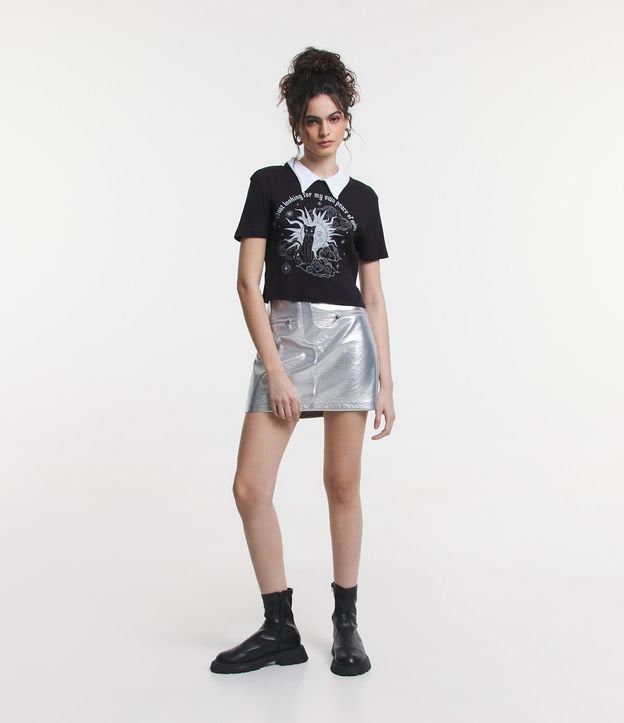Saia reta metálica de PU com cós envolvente e bolsos prateados