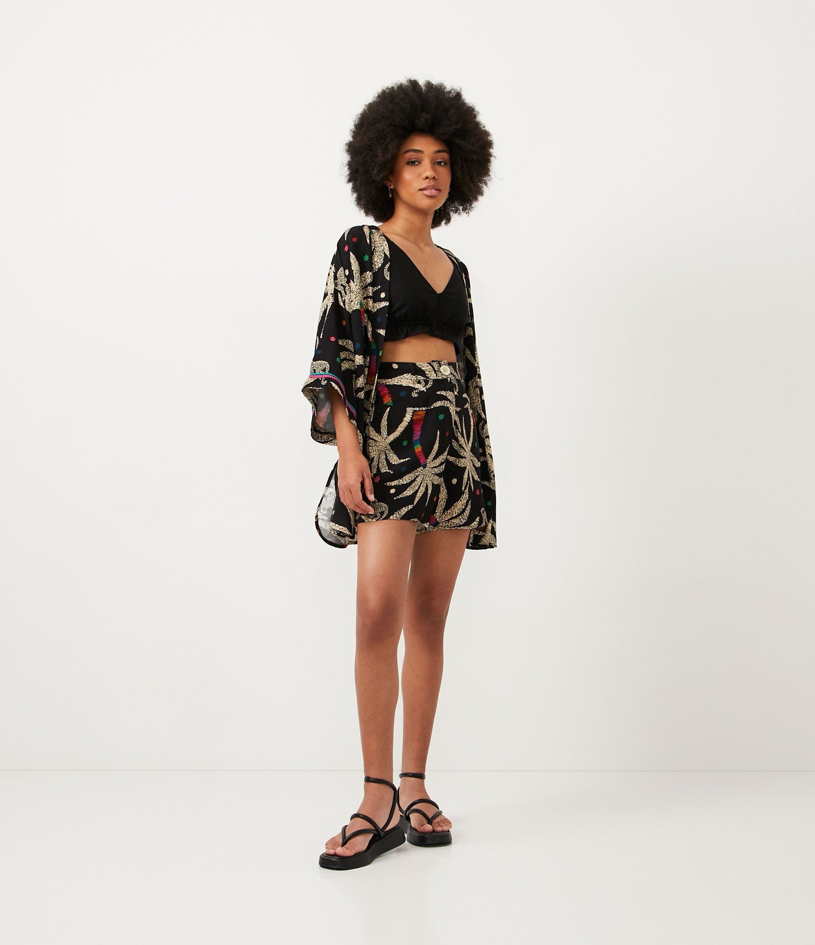 Shorts Viscolinho de cintura alta com estampa de palmeiras tropicais e pretas