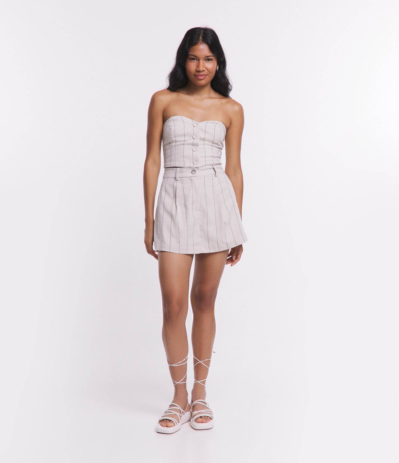Saia de linho listrada com cós abotoado em bege da Blue Steel - Experimente a combinação perfeita de conforto, qualidade e estilo em cada peça.