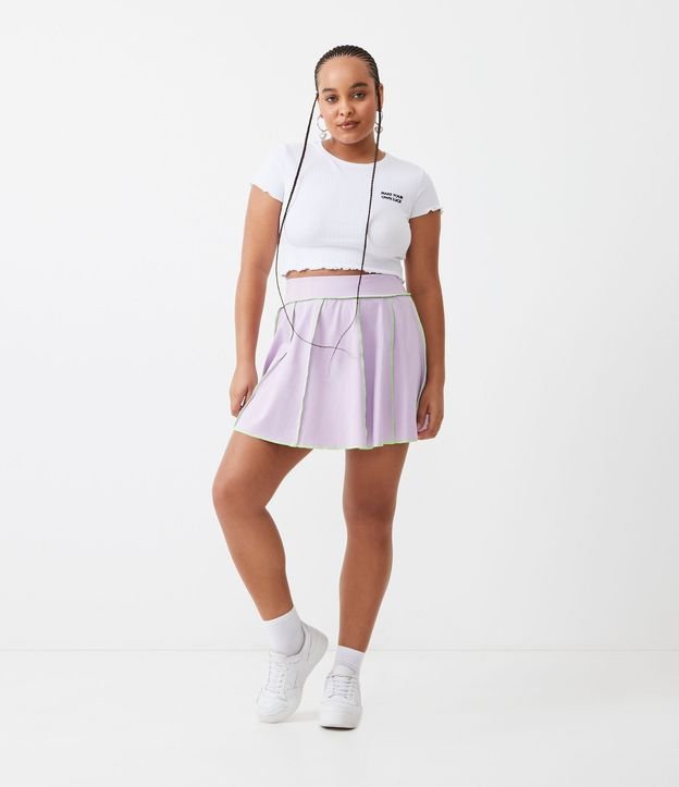 Mini-saia plissada lilás de cintura alta com costura contrastante