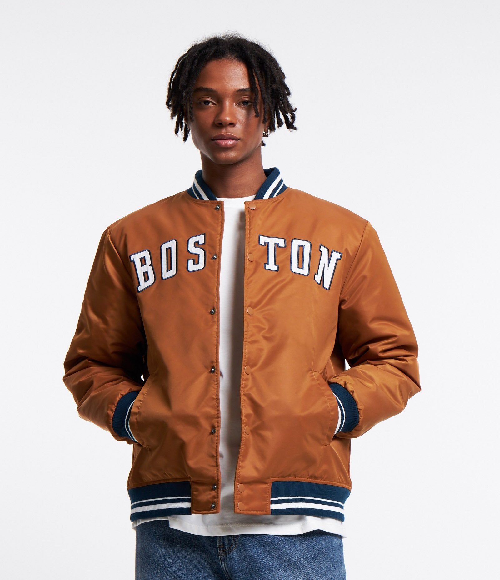 Jaqueta Bomber Bege com Letras Boston College