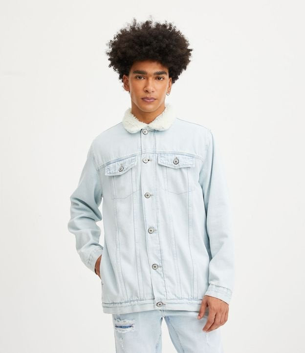 Jaqueta de brim azul-claro com forro de sherpa e detalhes recortados