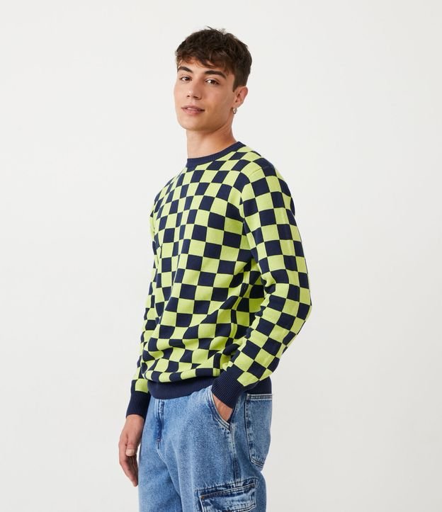Suéter de algodão xadrez azul escuro de ajuste regular com punhos ajustados