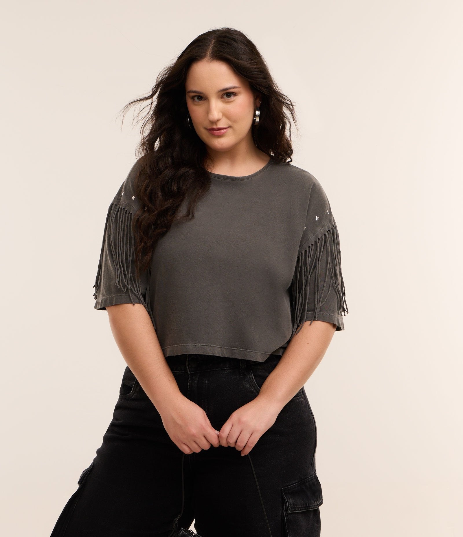 Blusa de algodão preta com franjas e tachas - Curve e Plus Size