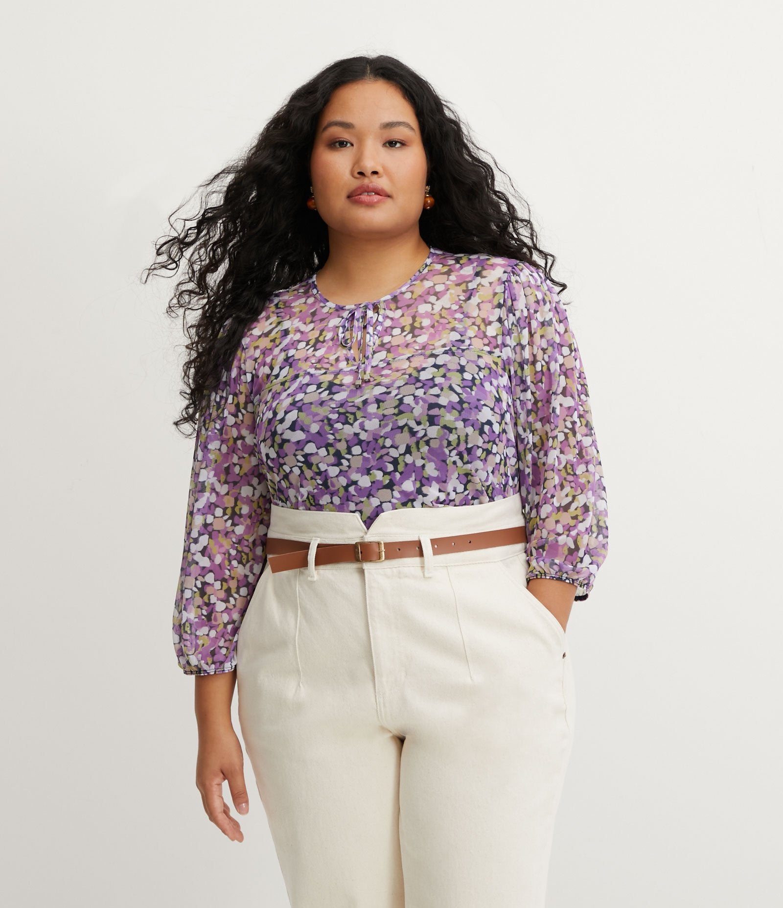 Blusa de tule com gola amarrada e estampa de mini pontos, Curve & Plus Size, Lilás