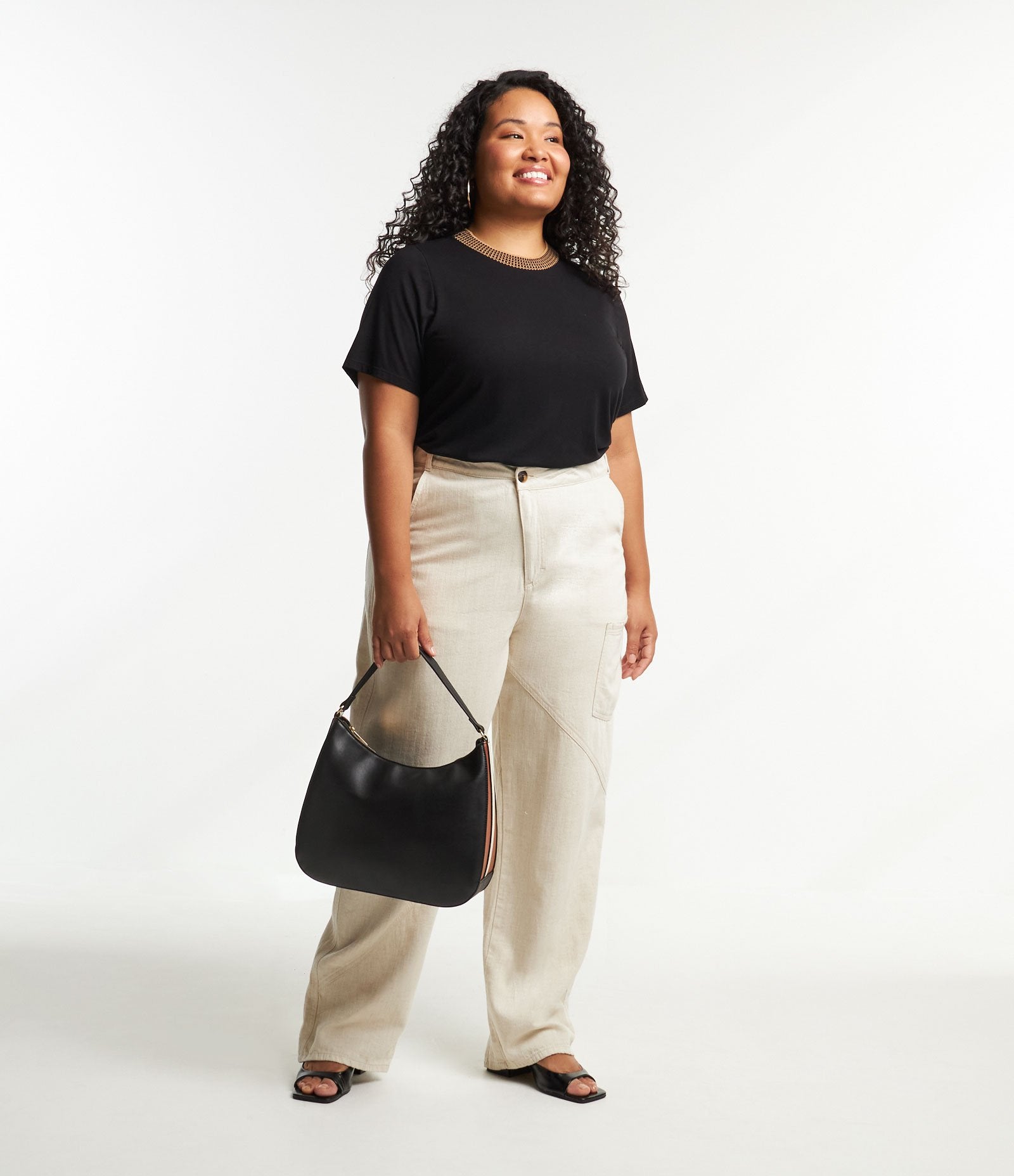 Calça de sarja de perna reta com mosca deslocada e painéis nas pernas, Curve e Plus Size, Beige Raw