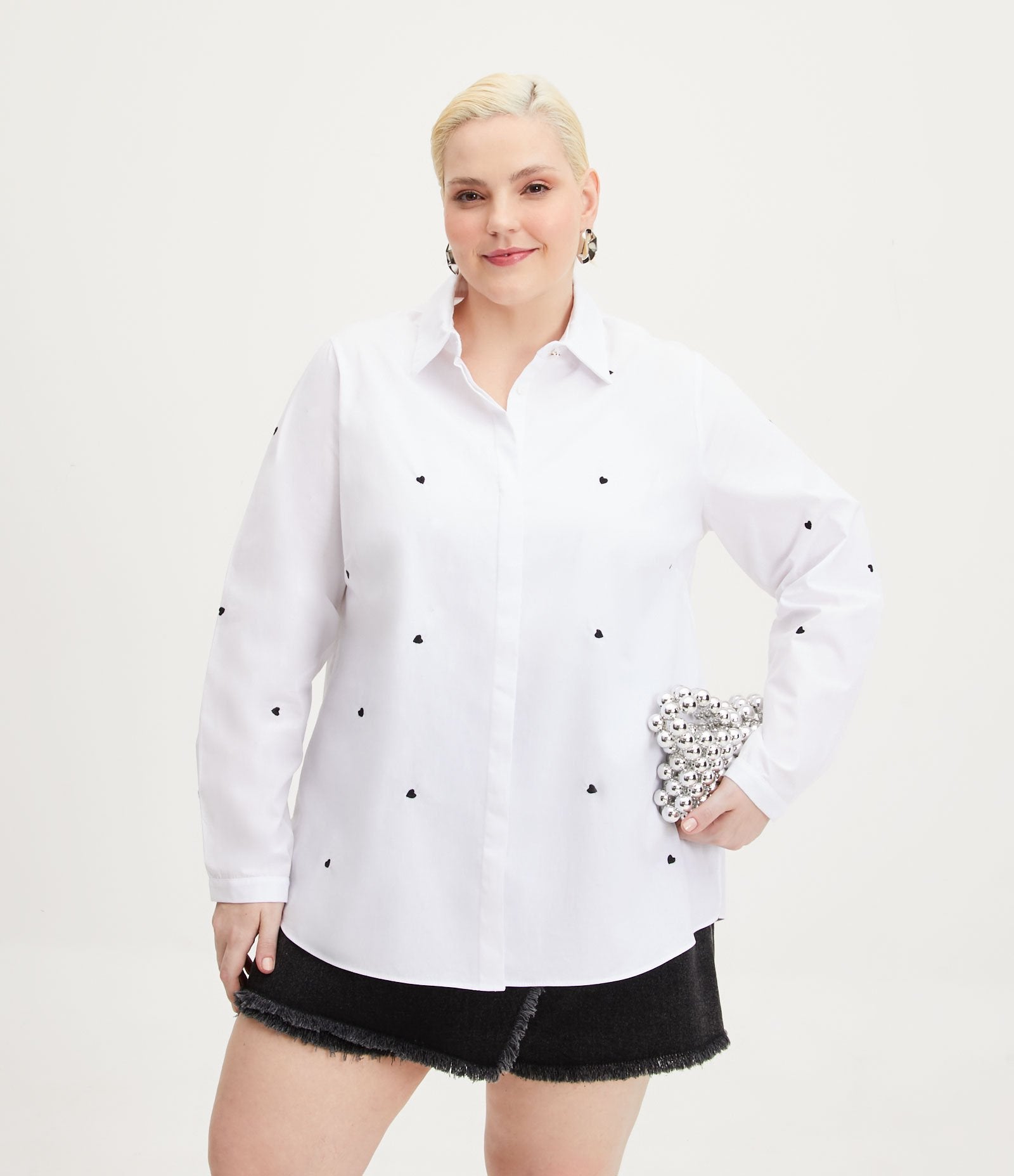 A Camisa Longa Tricoline Corações Bordados Branca de Neve da Ashua Curve foi criada para celebrar as curvas com estilo e confiança. Ideal para qualquer ocasião, essa peça combina perfeitamente conforto e elegância em um design lisonjeiro.