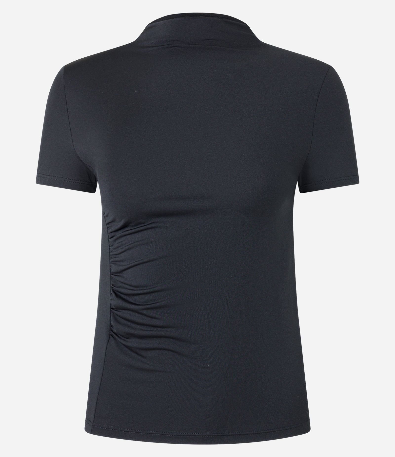 Blusa preta de microfibra com gola alta e franzidos
