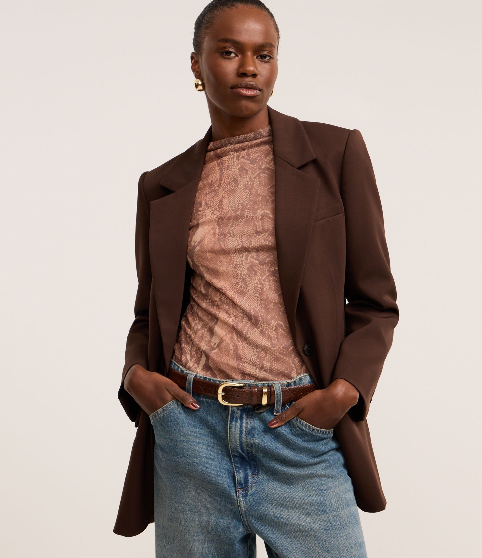 Blusa de Tule com Estampa de Cobra Marrom e Gola Alta