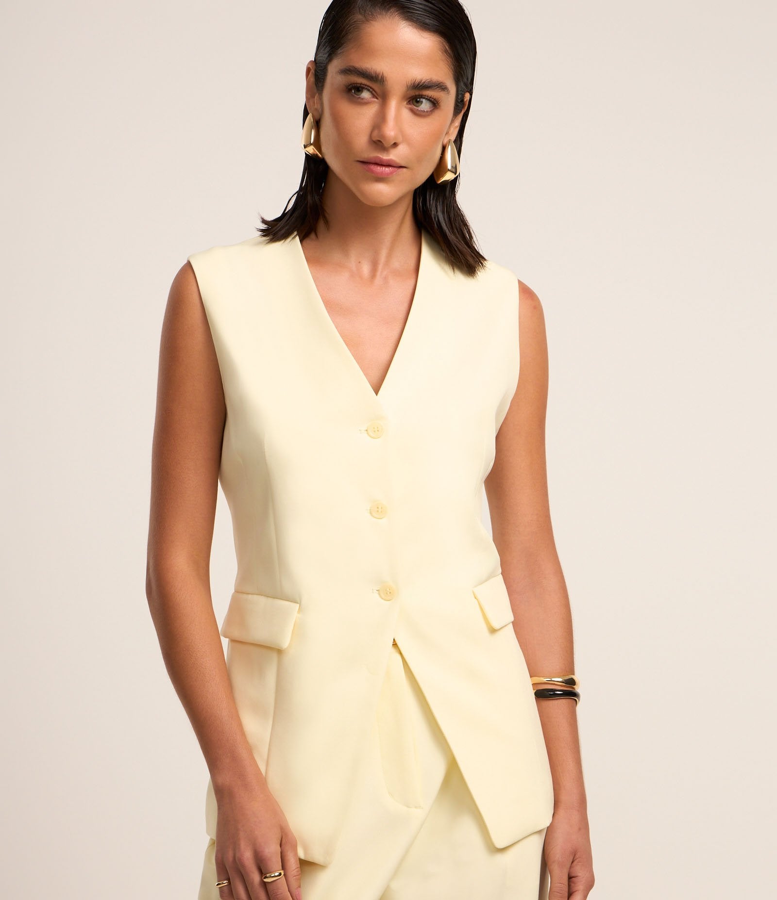 Colete Longo Sob Medida com Bolsos Frontais e Barra com Detalhe em V na Cor Bege