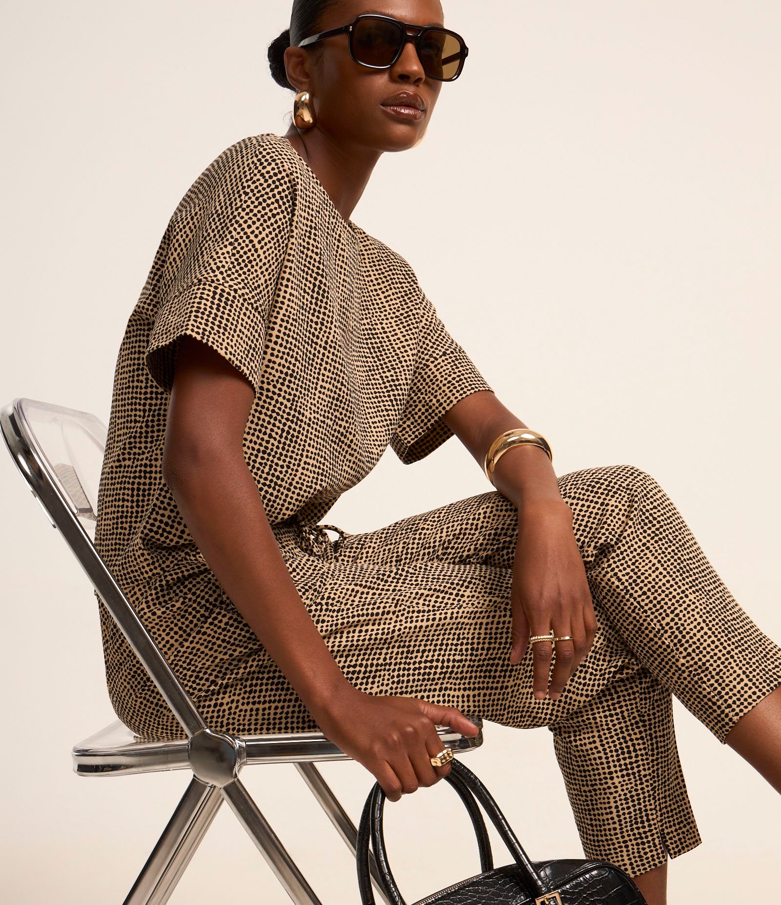 Calça de crepe fluido com estampa exclusiva de bolinhas marrons da Cortelle - Experimente o conforto, a qualidade e o estilo em cada peça.