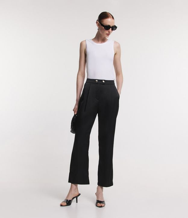 Calça de cetim de perna reta com cós sobreposto e dois botões em preto