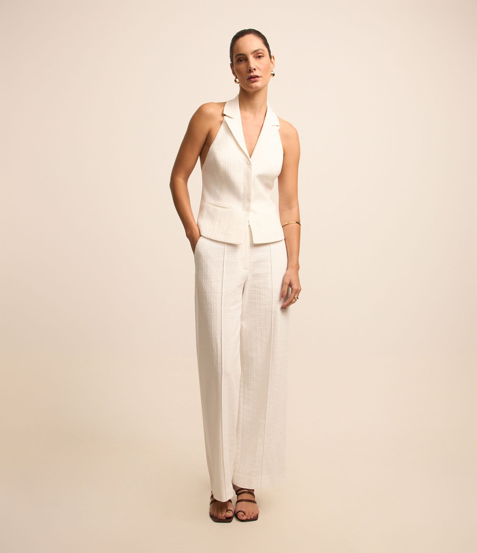 Calça reta branca texturizada de alfaiataria com abas