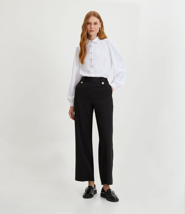 Calça reta com pregas frontais e botões em preto