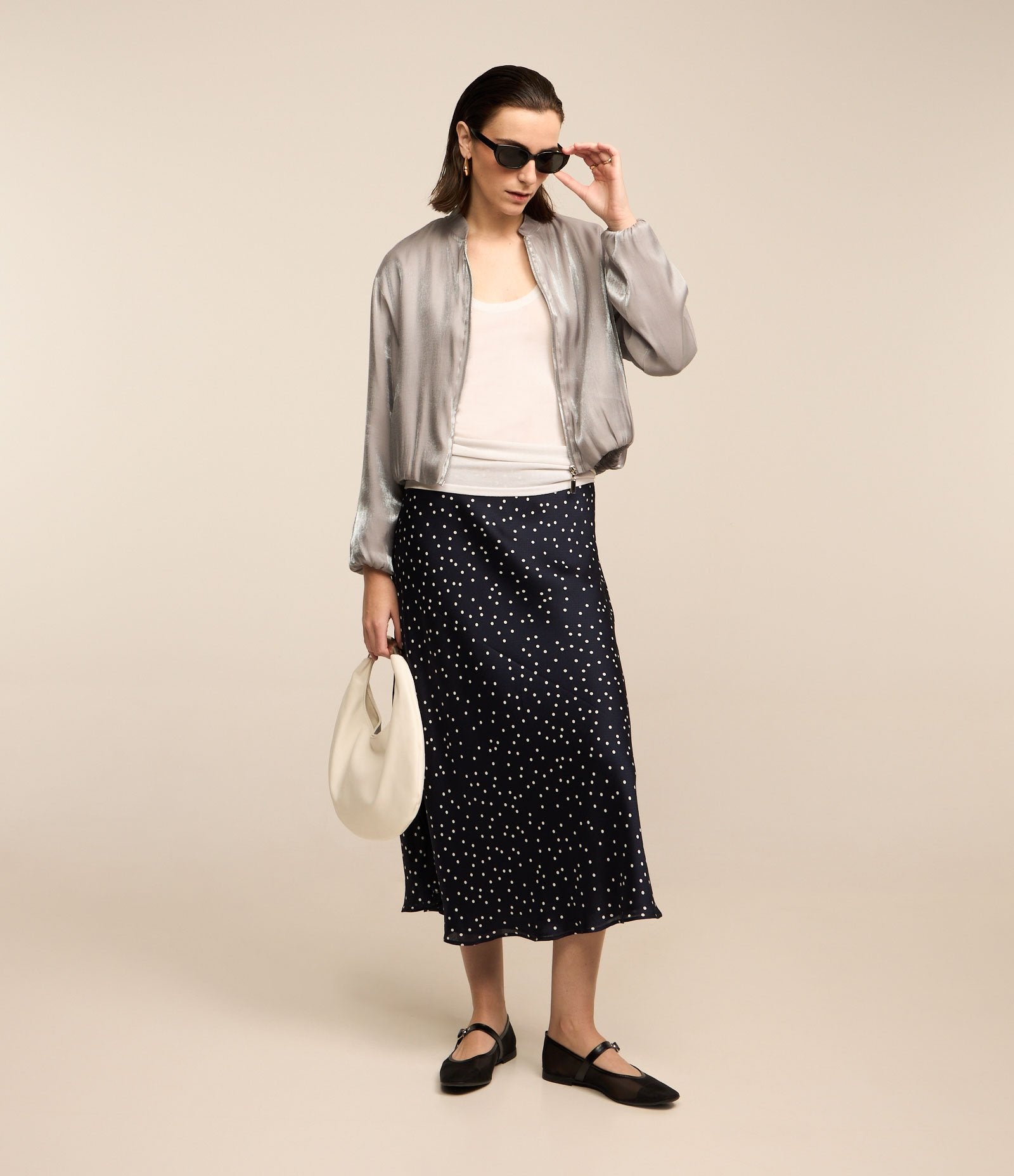 Saia Midi A-line em cetim com estampa de bolinhas azul-marinho da Cortelle - Experimente o conforto incomparável, a qualidade excepcional e o estilo atemporal em cada peça.
