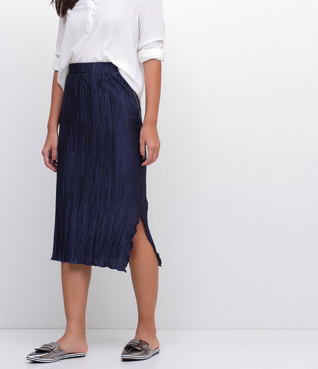 Saia midi plissada azul metálica da Cortelle - Experimente a combinação perfeita de conforto, qualidade e estilo em cada peça.