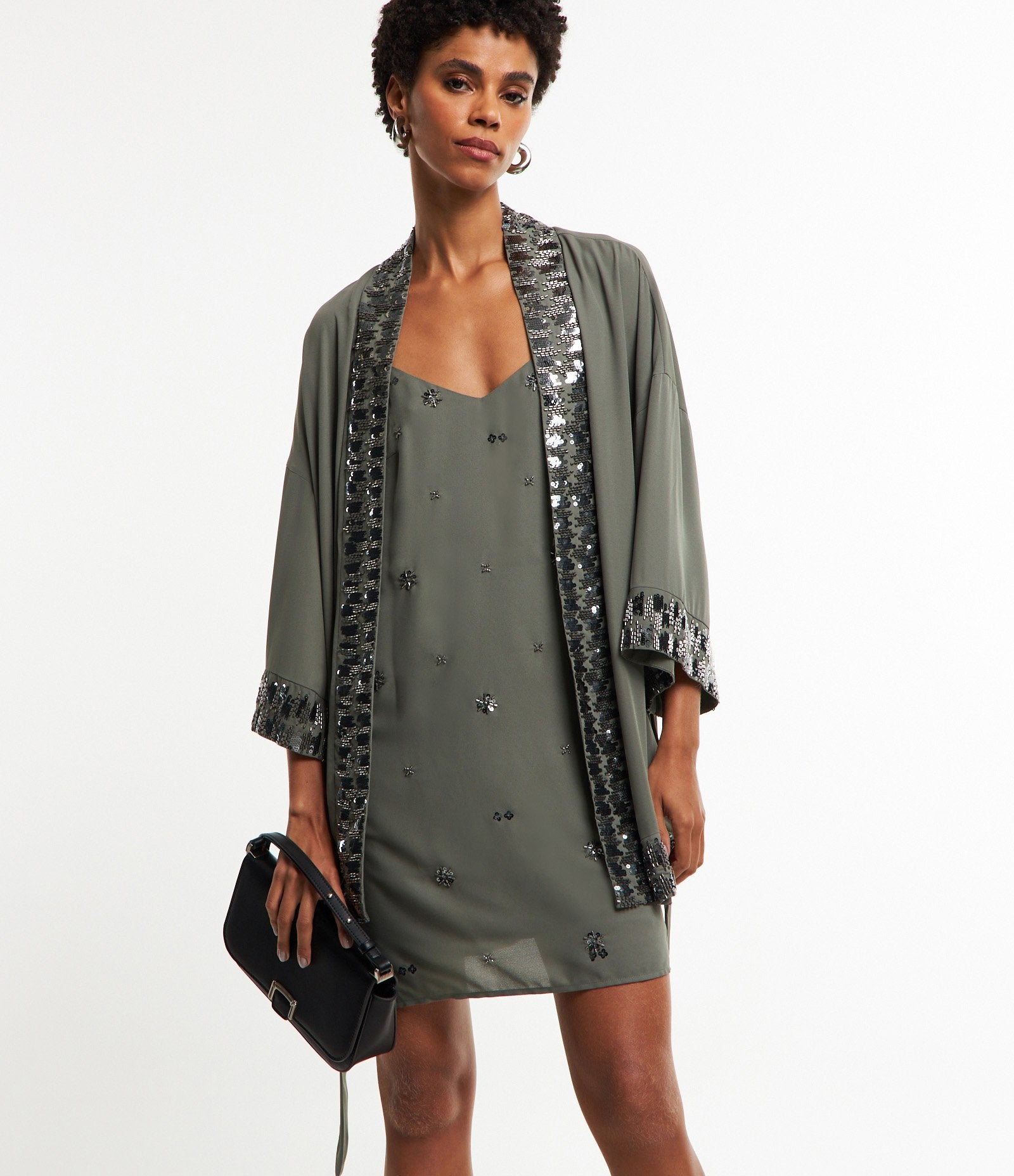 Kimono de tecido de cetim com amarração na cintura e bordado de lantejoulas cinza