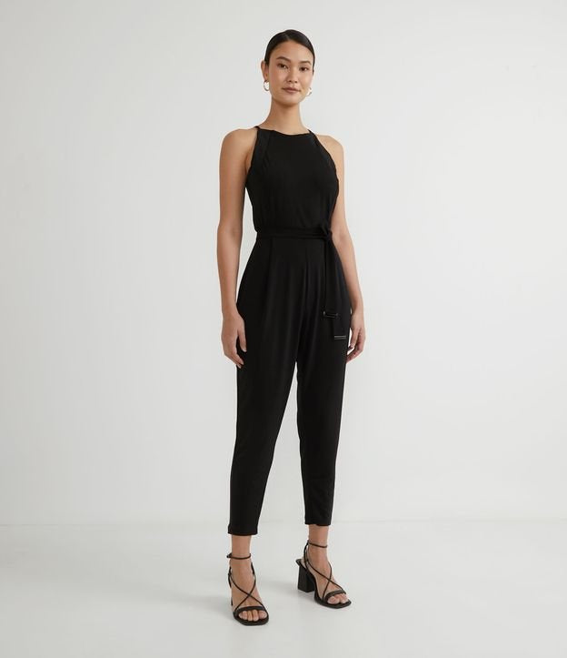 Macacão longo de jérsei com detalhes nas cavas e cinto de amarrar em preto