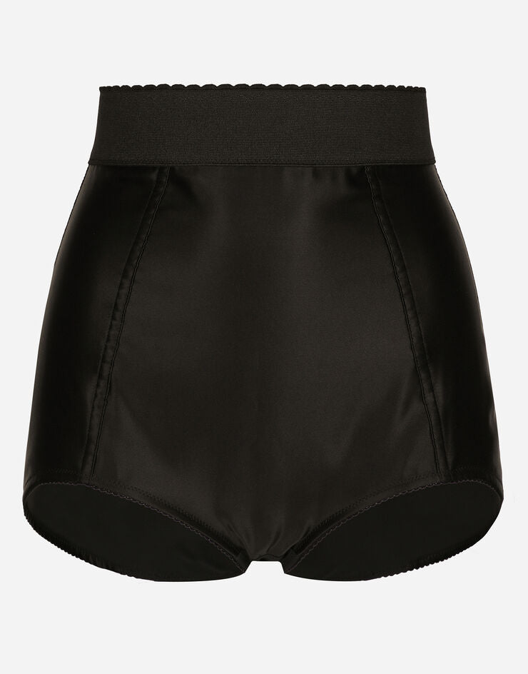 A calcinha de cintura alta Dolce & Gabbana, confeccionada em cetim de seda luxuoso e marquisette elástica, é a combinação perfeita de elegância e conforto para looks essenciais e uso diário.