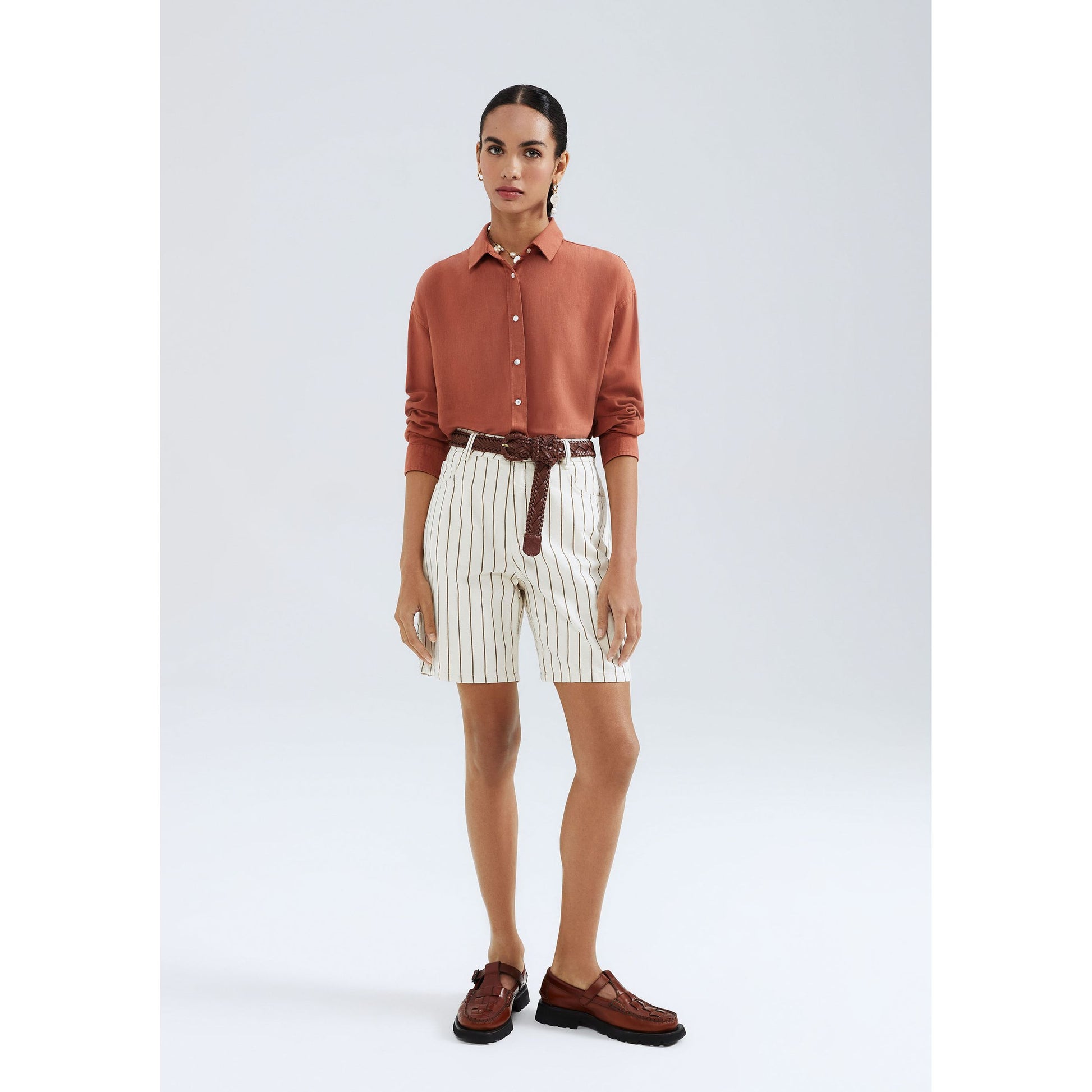 O Shorts de sarja listrado de cintura média feminino em off white da Hering é perfeito para você criar looks essenciais e para o dia a dia.
