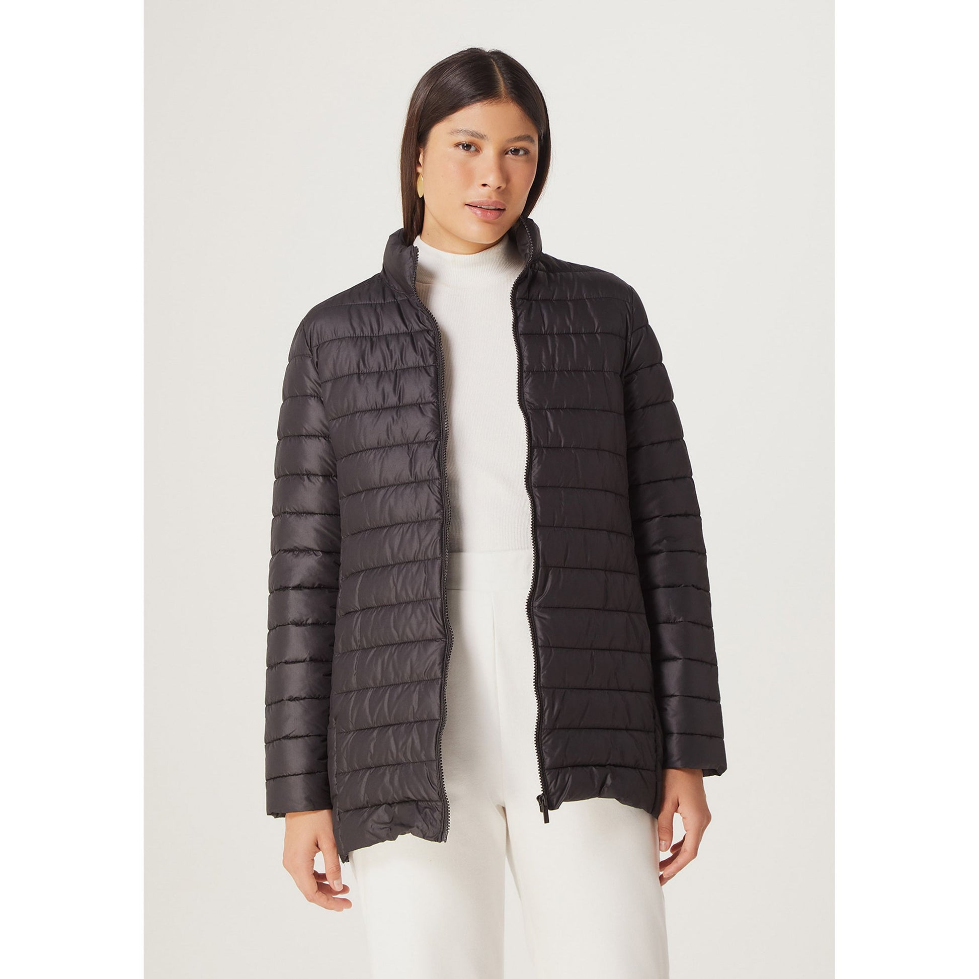 A Jaqueta Puffer Longa Quilted Feminina Básica em Preto da Hering é o complemento perfeito para o seu guarda-roupa para um estilo essencial e cotidiano.