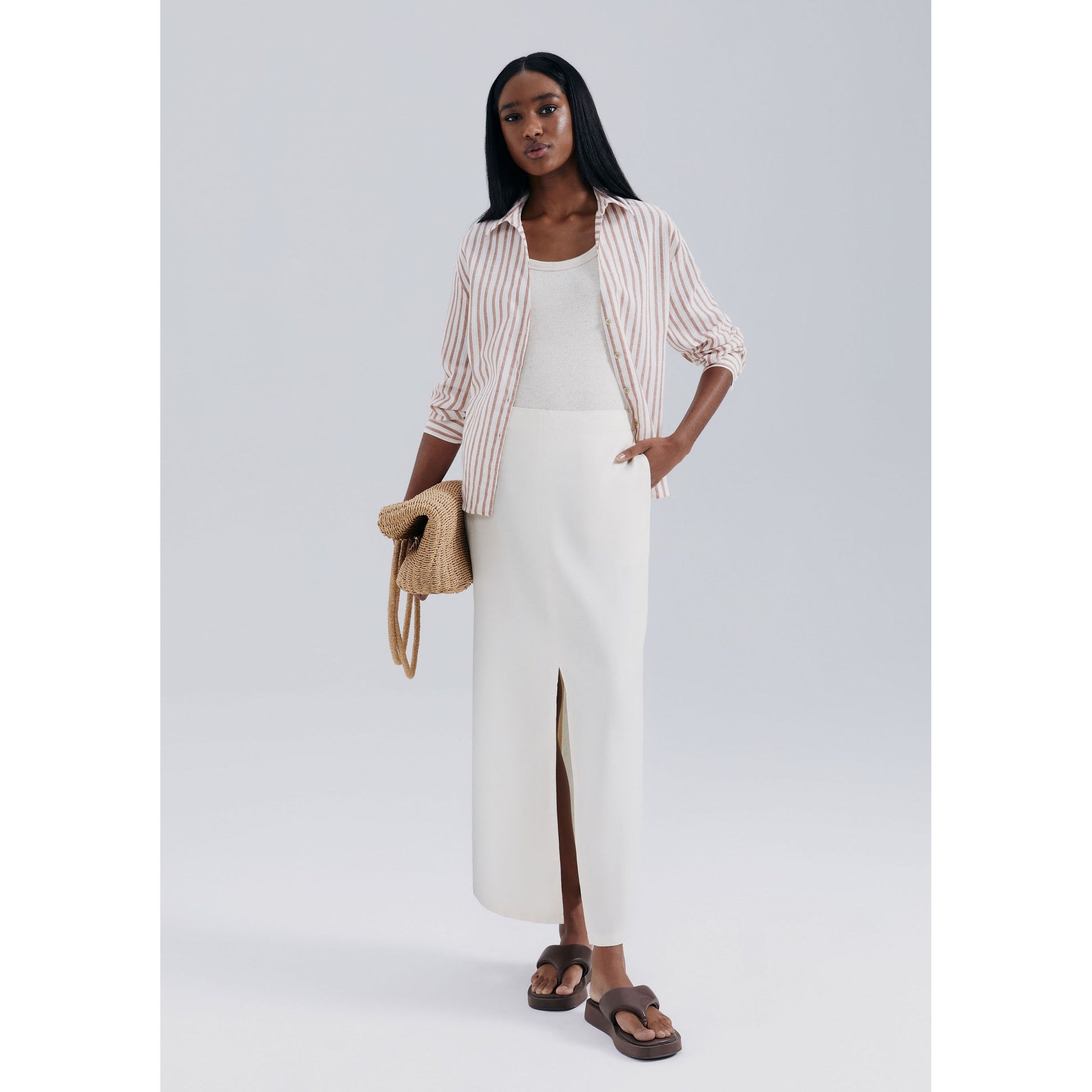 A Saia Midi de Linho de Cintura Média em Off White da Hering é a adição perfeita ao seu guarda-roupa para você criar looks versáteis e atemporais. Ideal para o uso diário, essa saia combina conforto e estilo sem esforço.