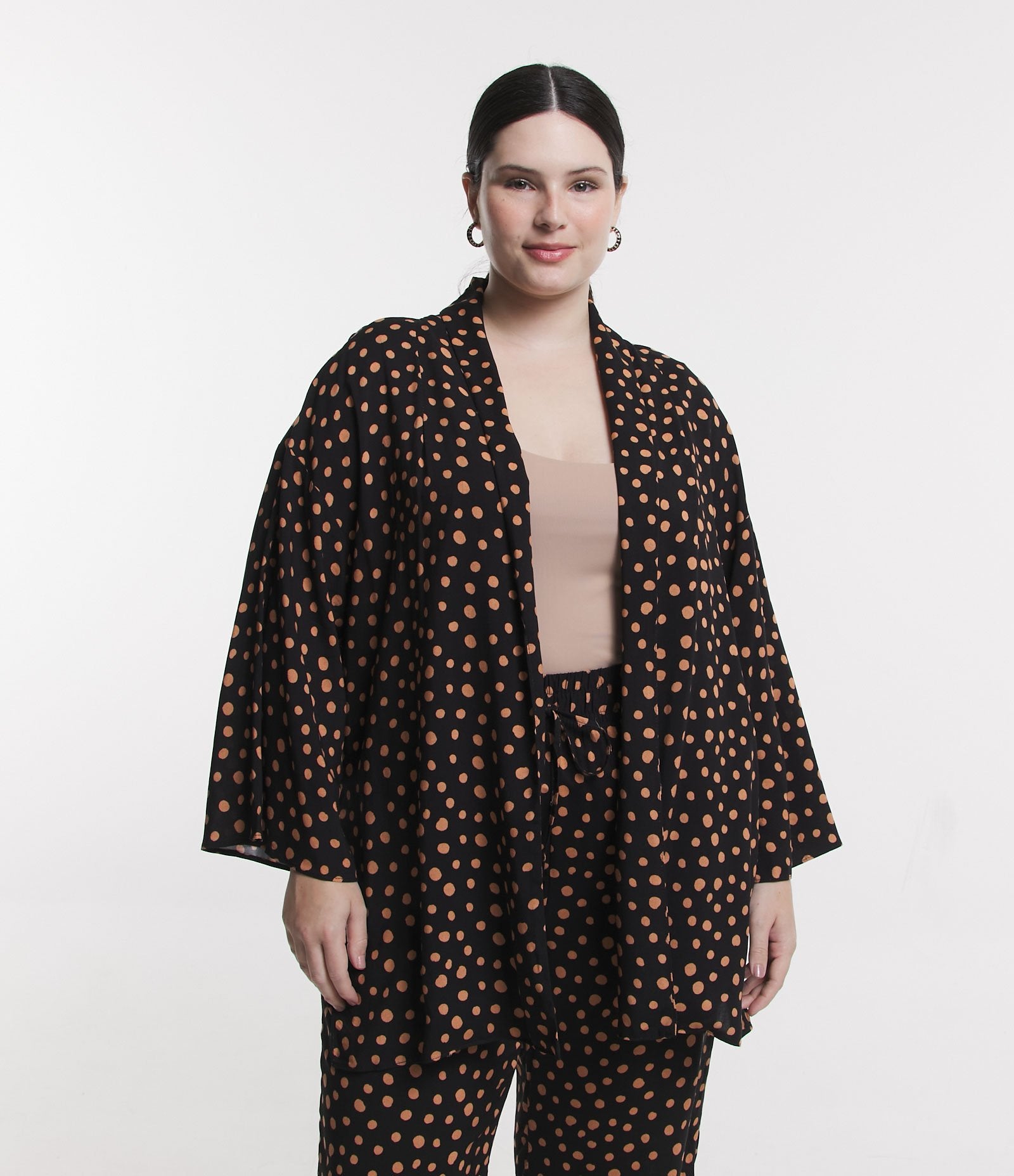 O quimono de comprimento estendido com estampa de bolinhas para tamanhos curvos e plus size em preto da Ashua Curve foi criado para celebrar as curvas com estilo e confiança. Ideal para qualquer ocasião, essa peça combina perfeitamente conforto e elegância em um design lisonjeiro.