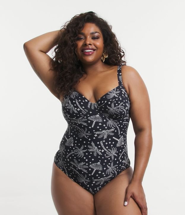 Maiô preto meia-copa em poliamida com alças ajustáveis e estampa de palmeira - Curve e Plus Size