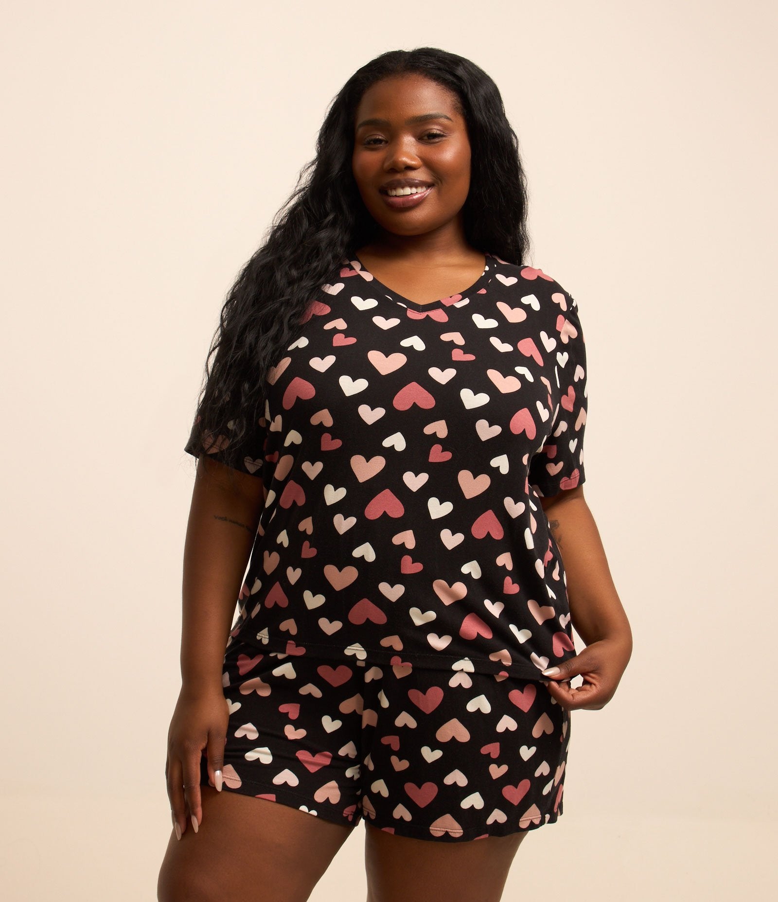 Pijama curto de viscose com estampa de coração, Curve & Plus Size, preto